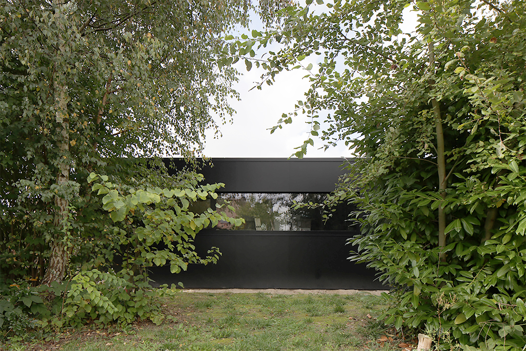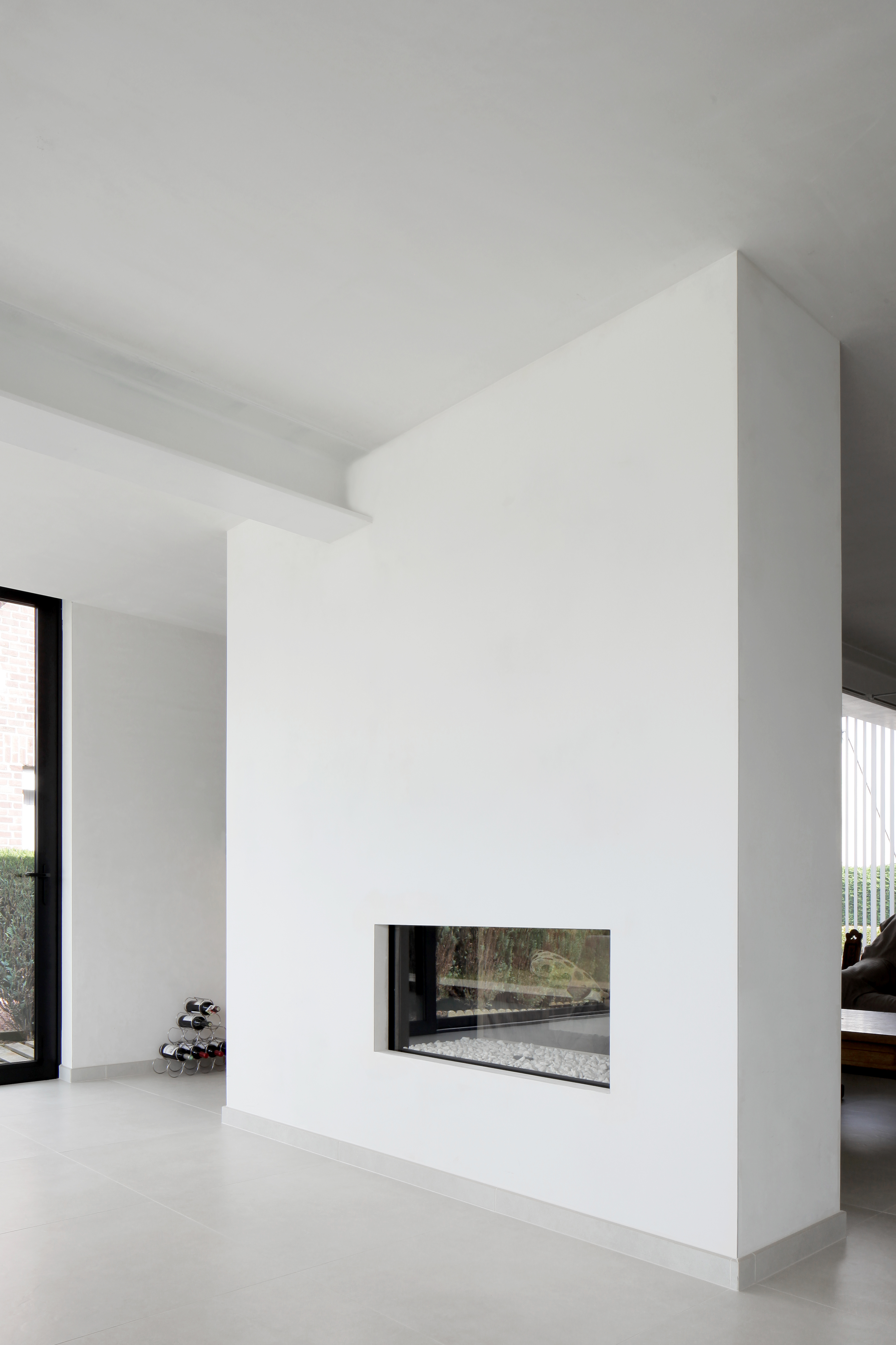 De leefzone van de bestaande woning werd volledig opengewerkt en rondomrond de woning uitgebreid, zodat de bestaande woning als het ware volledig wordt ingepakt met een nieuw en strak volume. De bovenverdieping wordt volledig opgevangen door zware metalen liggers.